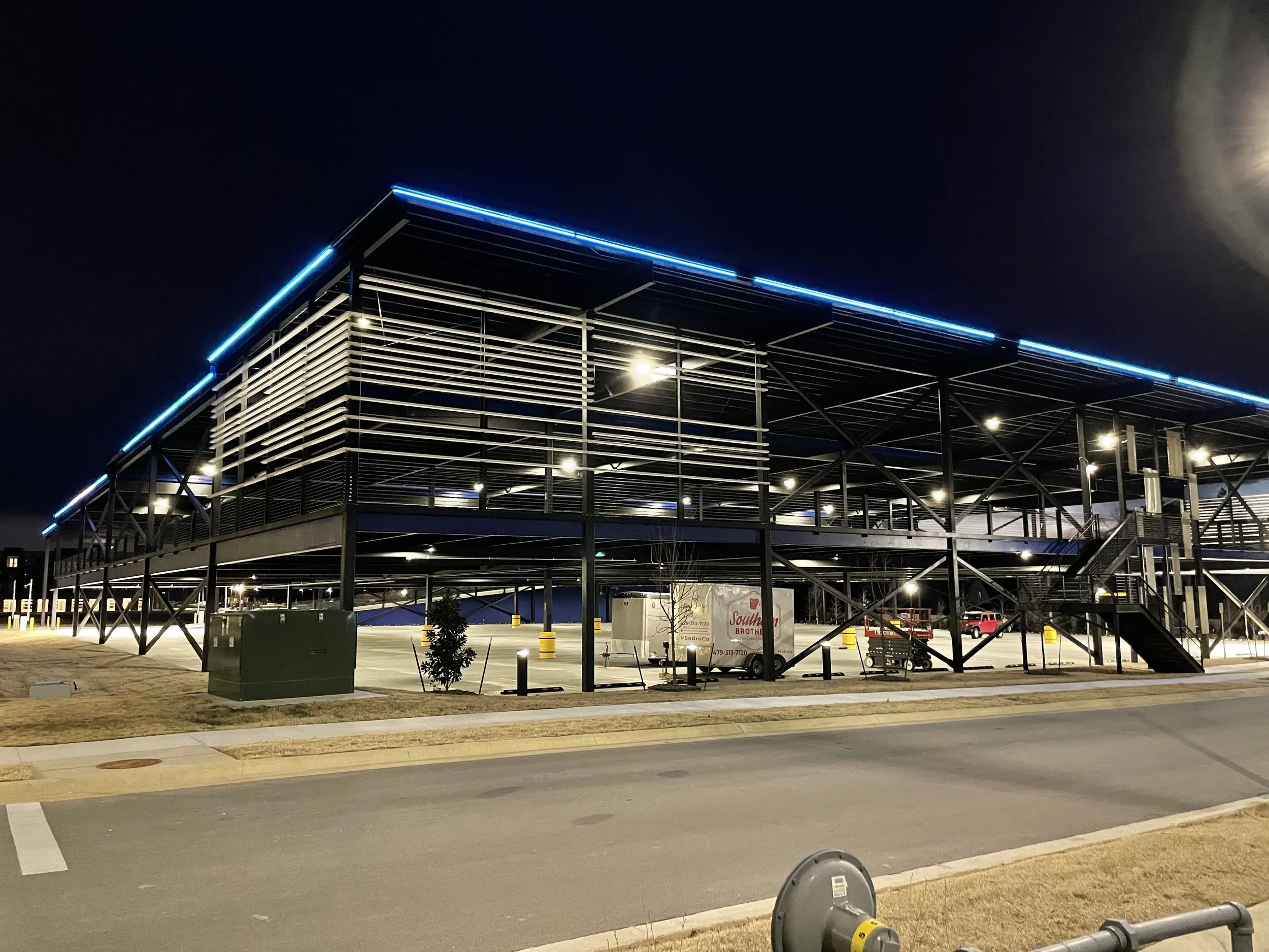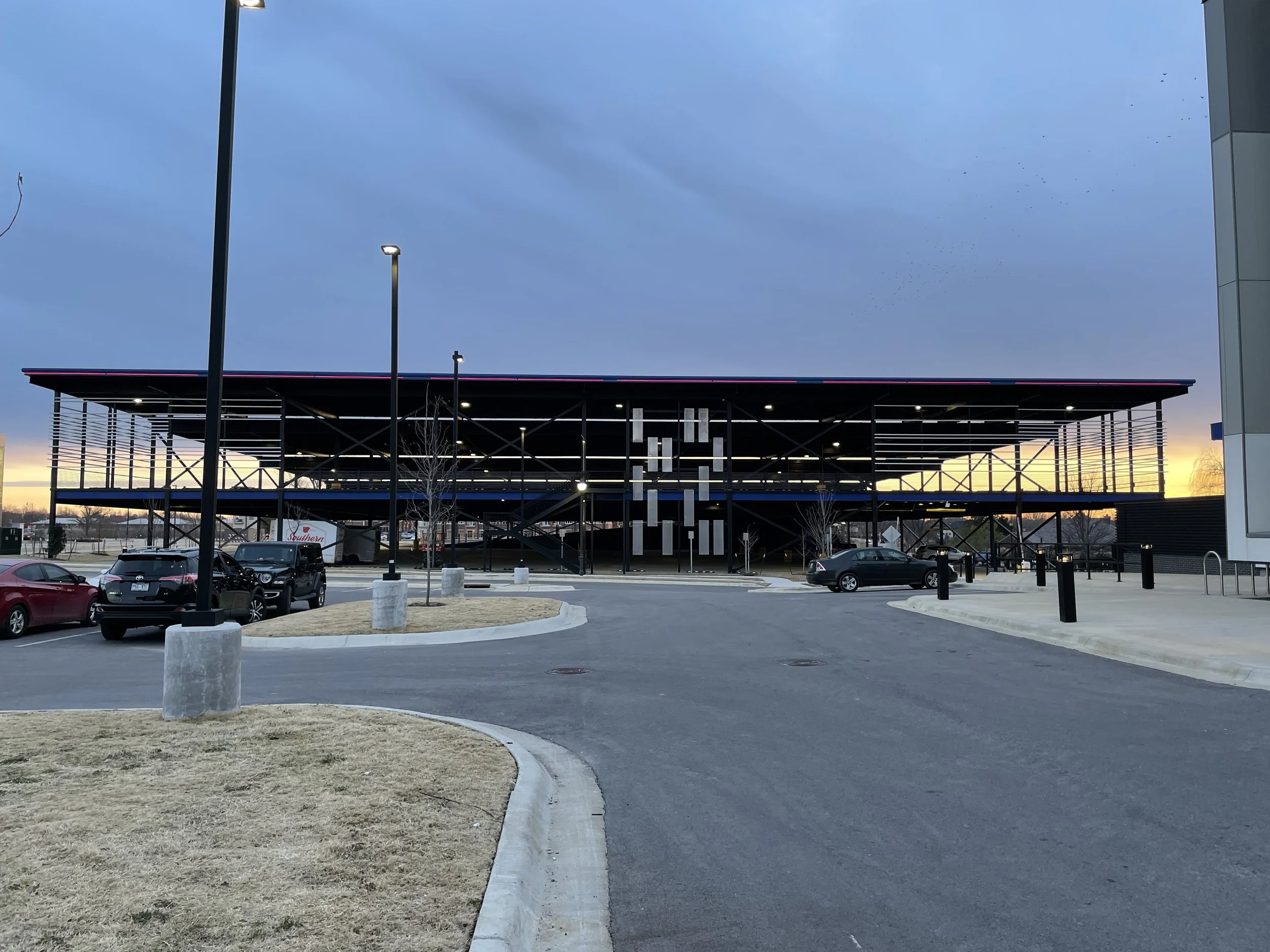 This is a new two-story parking deck located in the Pinnacle Hills area or Rogers, AR. It contains over 250 parking spaces, three cart-charging stations, and a storage area for maintenance equipment.